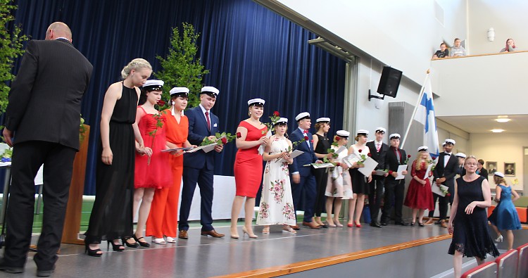 Seuraavana rehtori Mika Sirkka jakoi ylioppilastodistukset abiturienttien ryhmänohjaajan Katja Levomäen avustamana.